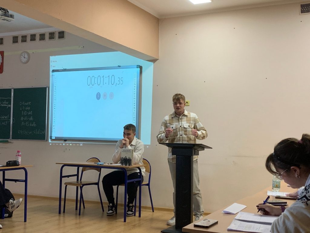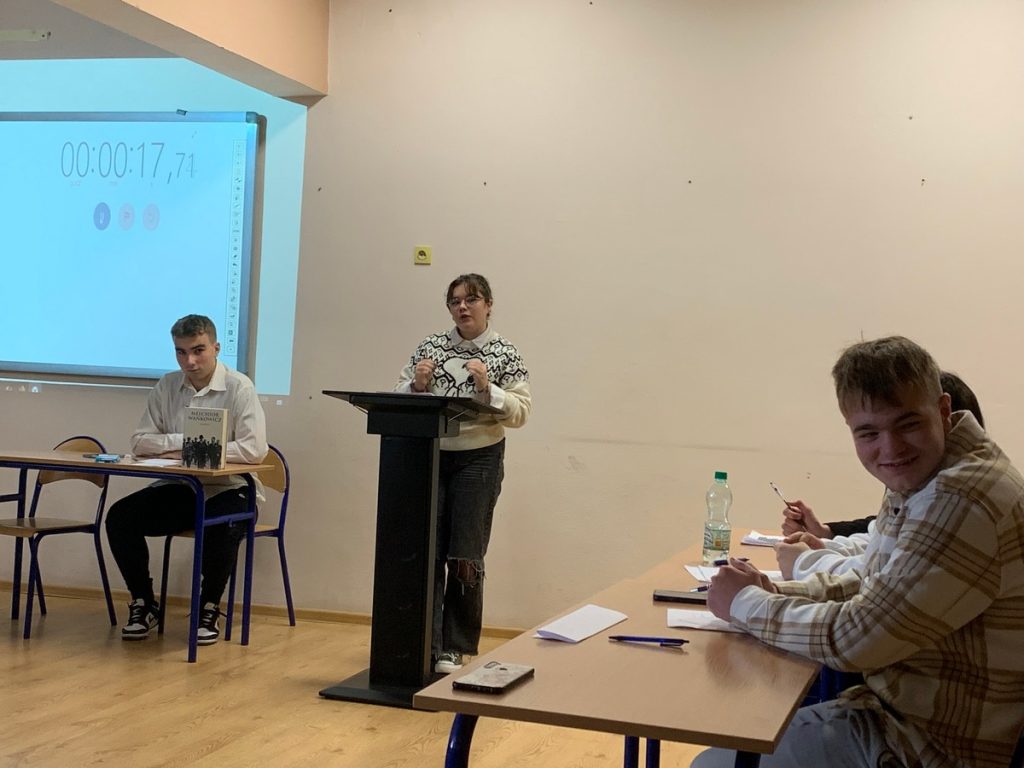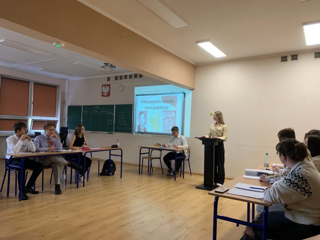 W ramach obchodów Narodowego Dnia Niepodległości zorganizowaliśmy w szkole debatę historyczną. Tym razem teza brzmiała: „Czy II Rzeczpospolita odniosła sukces gospodarczy”. W debacie brało udział ośmiu uczestników: Filip Chalcarz – 3a, Kinga Korcz – 3a, Julia Pacia – 3a, Mateusz Pukas – 4a, Aleksandra Trepka – 2a, Krzysztof Latos – 2a, Piotr Cieślik – 2a i Hanna Kruszak – 1a. Dochodziło do ostrej wymiany zdań, uczniowie zaś wykazali się dużym zasobem wiedzy w temacie. Ostatecznie ogłoszono remis pomiędzy uczestnikami. Debaty u nas w szkole zawsze prowadzone są w rzeczowej i kulturalnej atmosferze.
