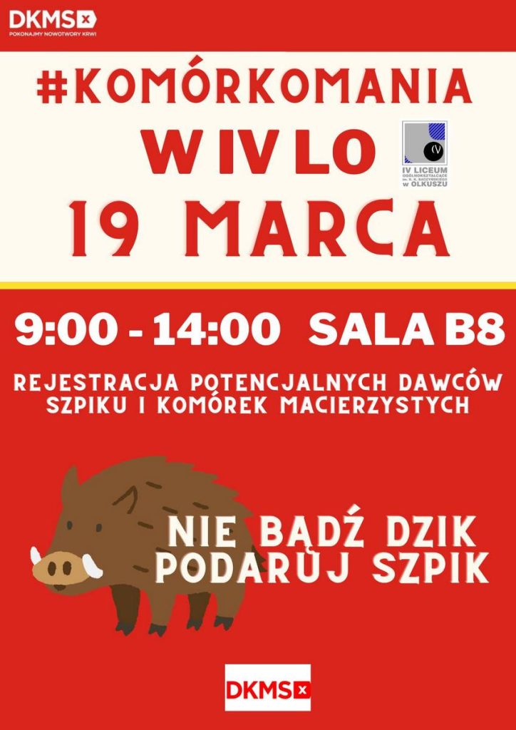 19 marca 2024 roku w naszej szkole odbędzie się rejestracja potencjalnych dawców szpiku i krwiotwórczych komórek macierzystych dla fundacji DKMS.