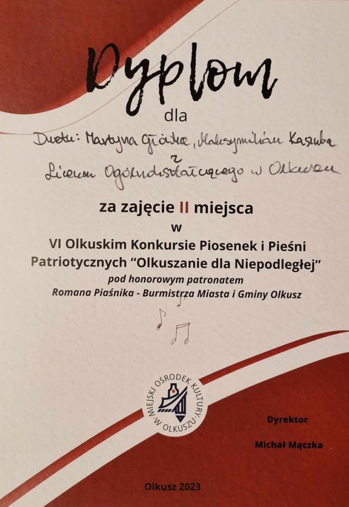 VI Konkurs Piosenek i Pieśni Patriotycznych „Olkuszanie dla Niepodległej” odbył się na scenie MOK Olkusz 19 października. To właśnie w nim Martyna Główka (2e) i Maksymilian Kaszuba (4f) wyśpiewali II miejsce! 11 listopada podczas Koncertu Laureatów zaśpiewali ponownie razem.