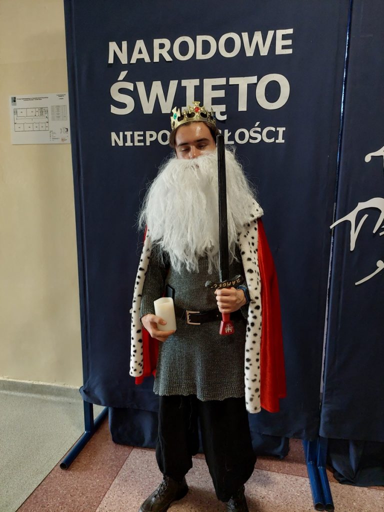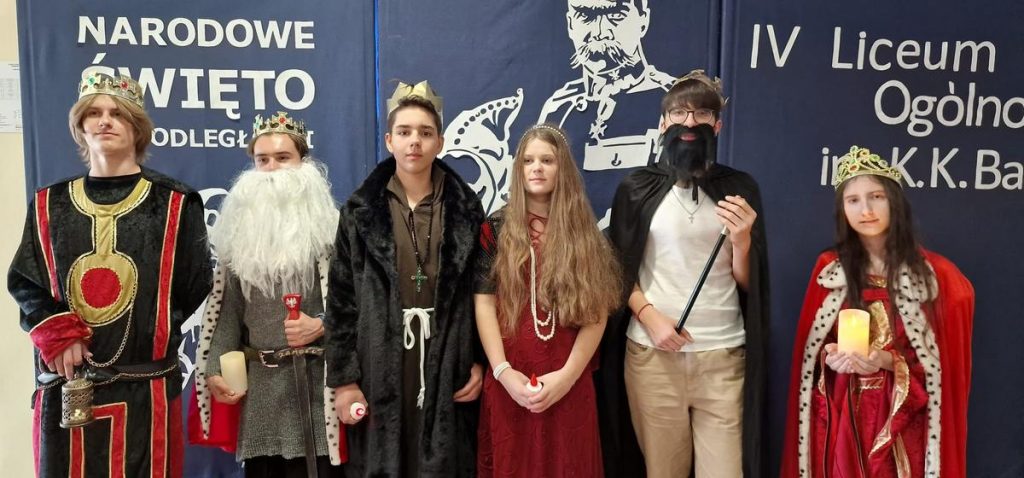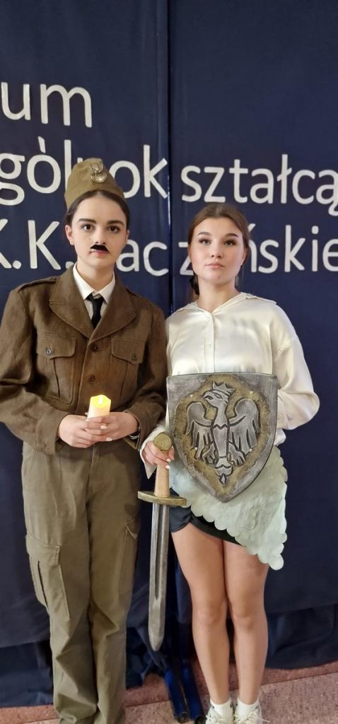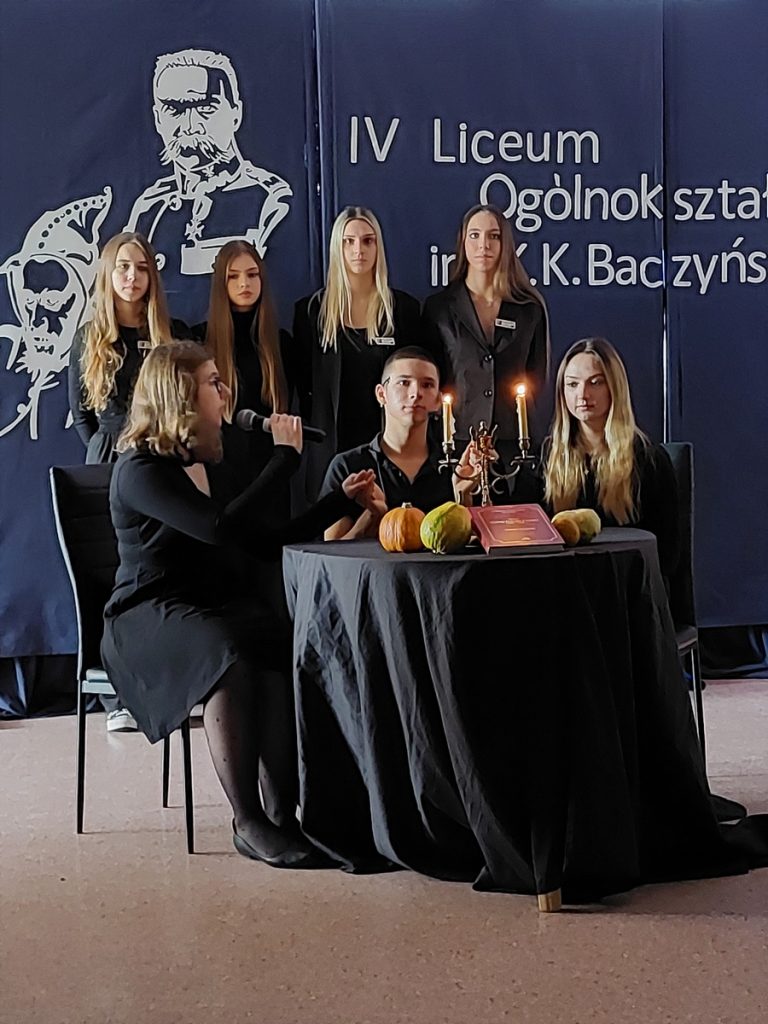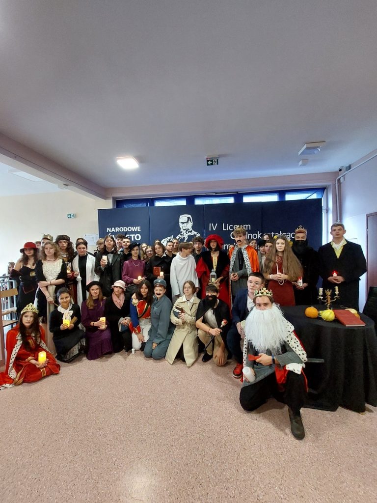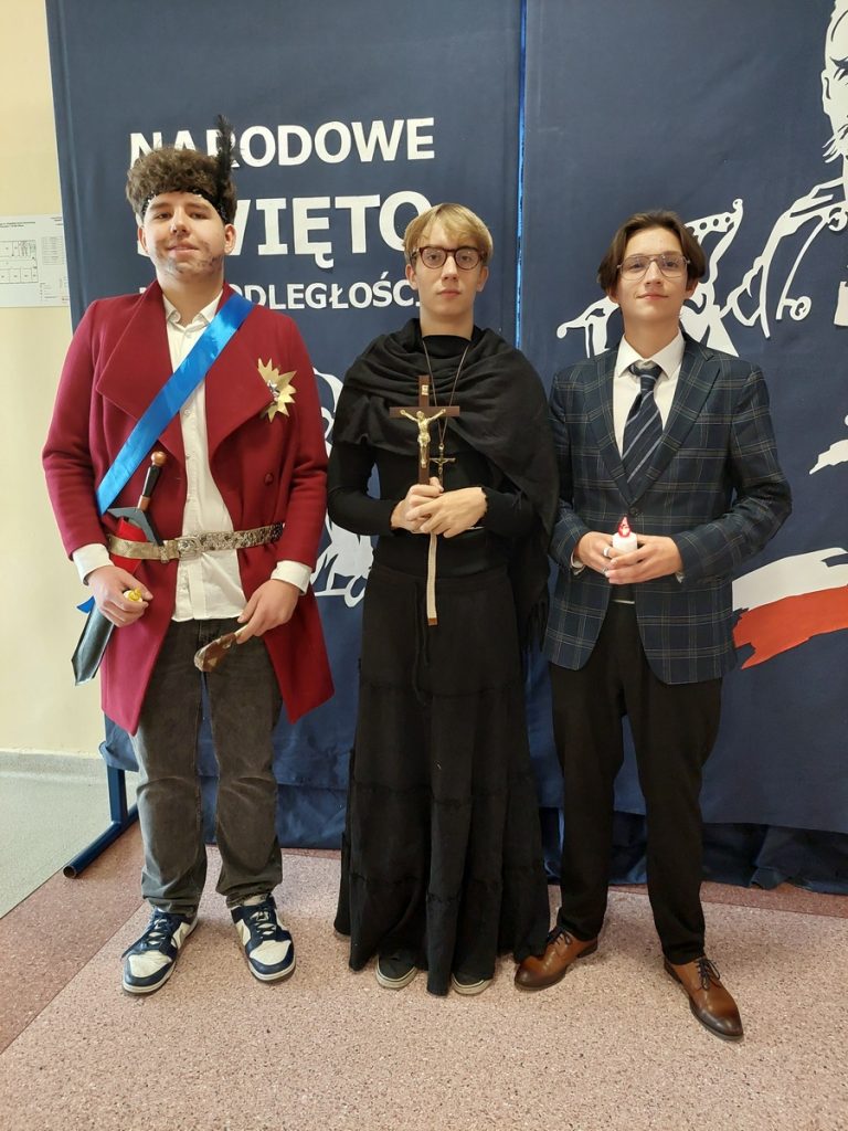 W piątek (10.11.2023 r.) obchodziliśmy w naszej szkole Narodowe Święto Niepodległości. Uroczystą akademię rozpoczął zespół instrumentalno-wokalny pieśnią „O mój rozmarynie rozwijaj się”. Potem recytatorzy, zasiadający przy okrągłym stoliku w świetle płonących świec, przywołali Chochoła i 39 widm postaci zasłużonych dla Polski.