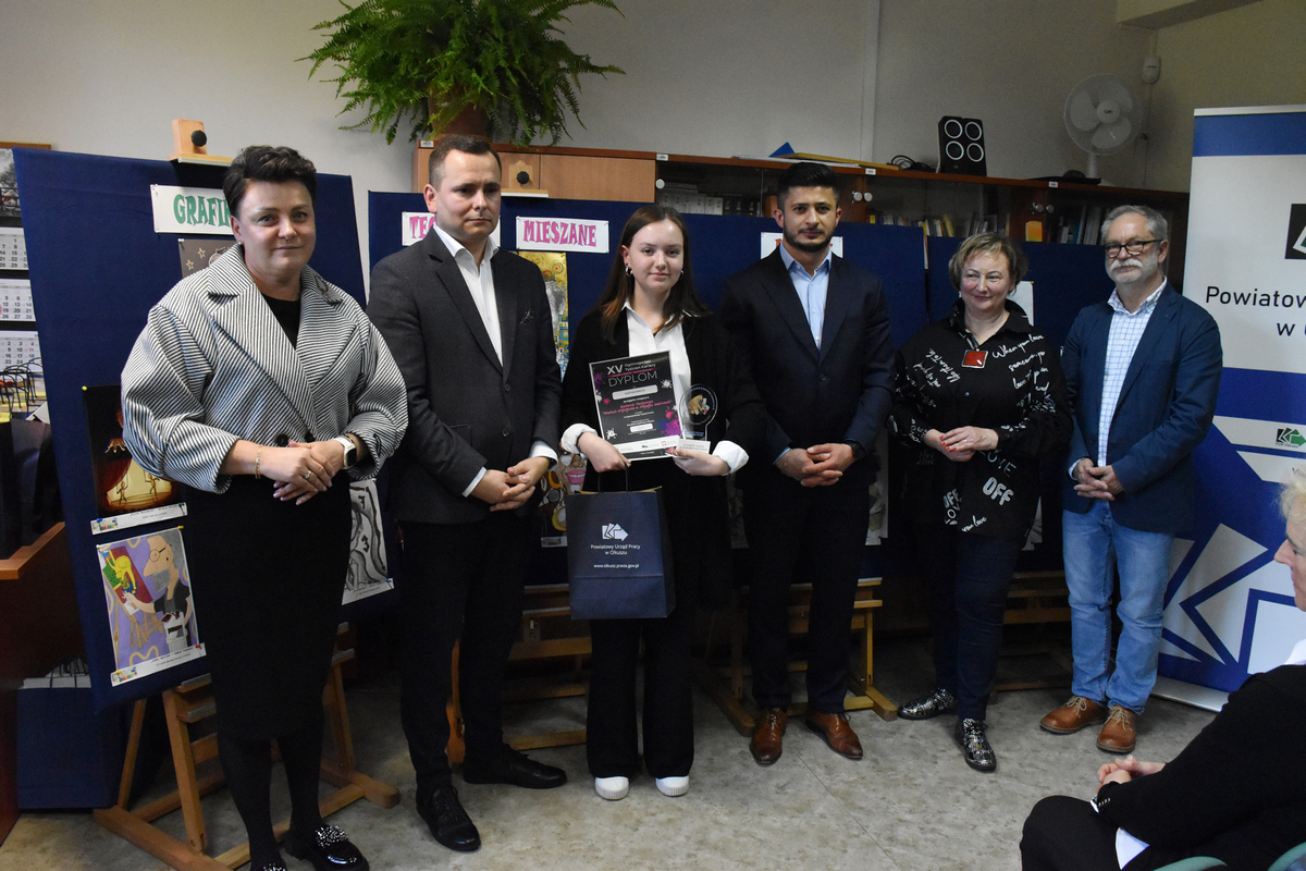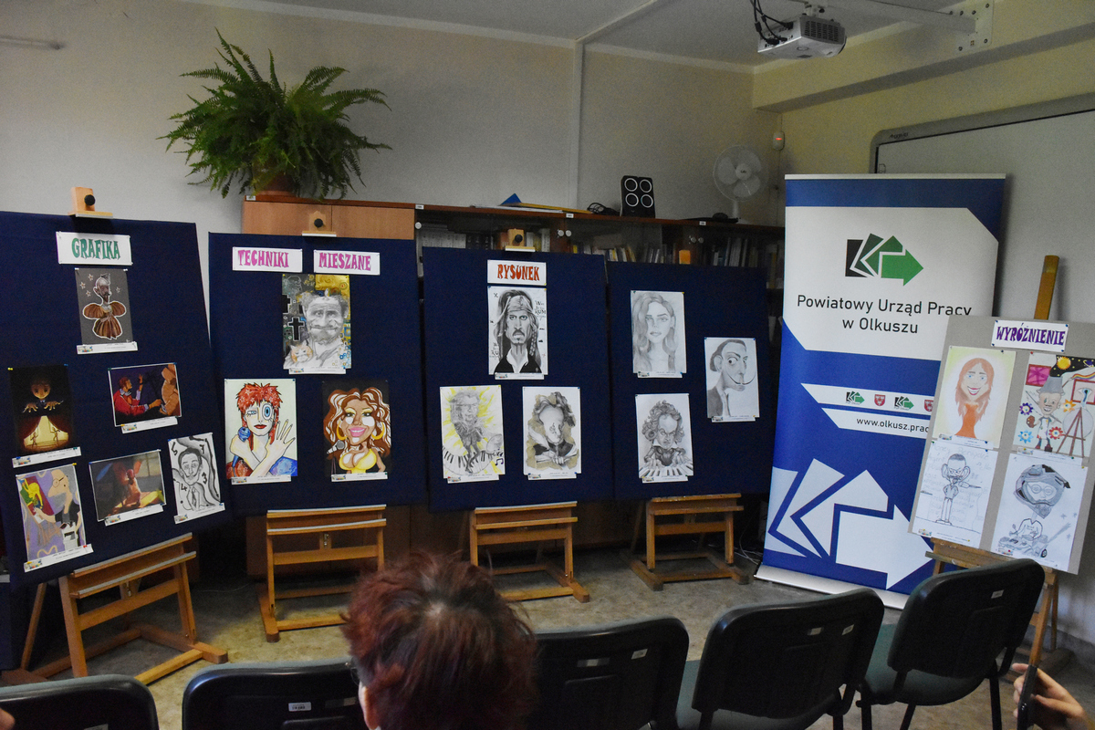 W dniu 18.10 br. w ramach XV Ogólnopolskiego Tygodnia Kariery pod hasłem „Talent i praca – to się opłaca” zorganizowanego przez Powiatowy Urząd Pracy w Olkuszu, odbyło się uroczyste otwarcie pokonkursowej wystawy plastycznej „Profesje artystyczne w krzywym zwierciadle”, w którym nasi uczniowie zdobyli wiele nagród i wyróżnień. Na konkurs wpłynęło 152 prace z różnych szkół ponadpodstawowych. Uczestnicy wykazali się niezwykłą wyobraźnią oraz kreatywnością w interpretacji tematu, co zaowocowało oryginalnymi pracami w technikach mieszanych, grafice komputerowej i rysunku.