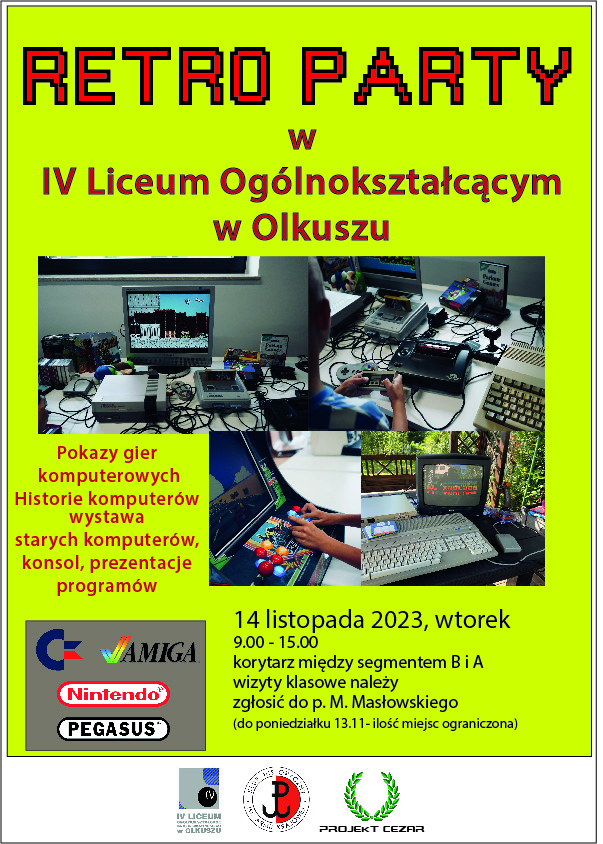 Zapraszamy uczniów 4 LO na Retroparty, pierwszy pokaz starych komputerów i konsol do grania przygotowany przez CezarProjekt, niezależnego kolekcjonera. Wydarzenie odbędzie się 14 listopada w godzinach 9-15.00. W programie pokazy konsol, gier i oprogramowania. Możliwość grania na starych kultowych grach oraz oprowadzanie po wystawie. Projekt będzie prezentowany na korytarzu między segmentami B i A. Istnieje możliwość zapisów pokazów na poszczególnych godzinach dla klas. W tym przypadku prosimy o kontakt z opiekunem projektu panem Michałem Masłowskim.