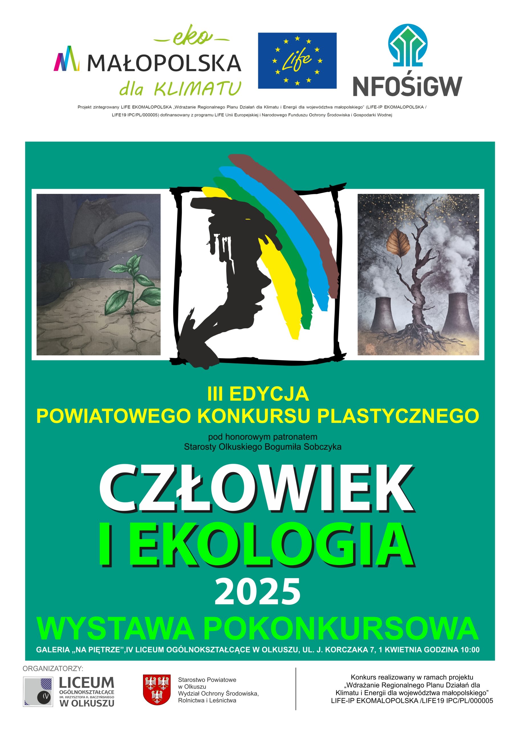 Rozstrzygnięto III edycję Powiatowego Konkursu Plastycznego „Człowiek i ekologia,” organizowanego przez IV LO w Olkuszu i Starostwo Powiatowe w Olkuszu, Wydział Ochrony Środowiska, Rolnictwa i Leśnictwa pod honorowym patronatem Starosty Olkuskiego Bogumiła Sobczyka. W konkursie wzięło udział 18 szkół podstawowych i 3 ponadpodstawowe. Dziękujemy uczestnikom oraz ich opiekunom za odzew oraz kreatywne zaangażowanie, czego owocem jest 318 prac plastycznych w różnych technikach. Uroczyste otwarcie wystawy oraz wręczenie nagród Laureatom odbędzie się 1 kwietnia (wtorek) 2025 roku w Galerii „Na Piętrze” w IV LO im. Krzysztofa Kamila Baczyńskiego w Olkuszu, ul. Korczaka 7 o godz. 10.00.