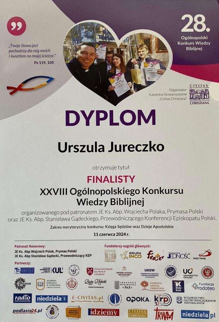 Z ogromną przyjemnością informujemy, że Ula uzyskała tytuł Finalisty etapu centralnego w Ogólnopolskim Konkursie Wiedzy Biblijnej.