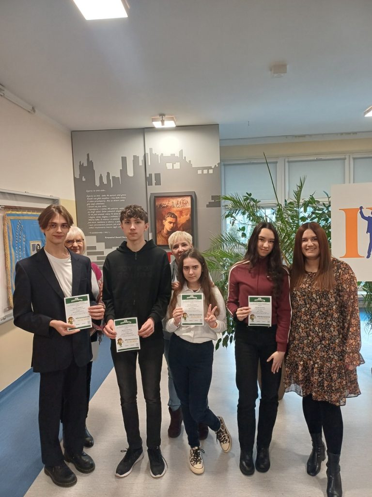 Dyplom uznania za uzyskanie bardzo dobrego wyniku otrzymali: Bartosz Barzycki – 1B, Emilia Rząd – 2H, Krzysztof Kulig – 4E, Amelia Lesikowska – 3E.