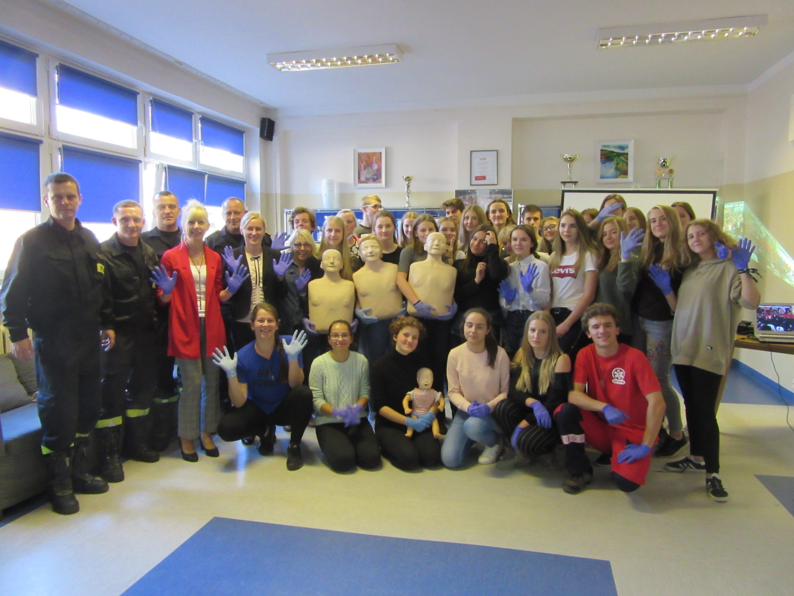 W czwartek 16 października 2018 r. wzorem lat ubiegłych wzięliśmy udział w biciu rekordu w jednoczesnym prowadzeniu resuscytacji krążeniowo-oddechowej na jak największej ilości fantomów przez jak największą ilość osób. W tegorocznej edycji, w ciągu pół godziny, 39 uczniów, 4 nauczycieli, 2 ratowników medycznych oraz 3 strażaków wykonywało resuscytację na 4 manekinach. W sumie każdy z ratowników wykonał przynajmniej 7 serii uciśnięć i wdechów. Akcję zorganizował Szkolny Patrol Pierwszej Pomocy pod wodzą pani Beaty Czeladzkiej.