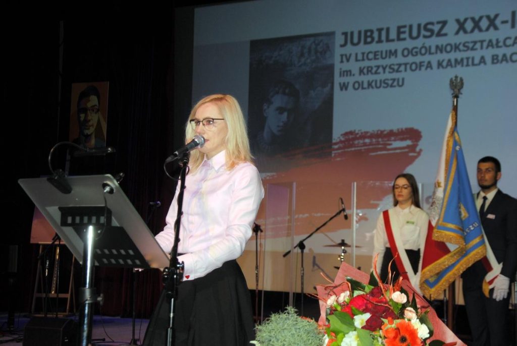 Gratulacje, podziękowania i życzenia na ręce Pani Dyrektor złożyli: Pani Agnieszka Ścigaj – Poseł na Sejm Rzeczpospolitej Polskiej. Pan Łukasz Kmita Wojewoda Małopolski, przedstawiciel Wiceministra Sportu Jacka Osucha – Dyrektor Biura Poselskiego Pana Wiceministra Pan Michał Zasucha, Pani Halina Cimer Małopolski Wicekurator Oświaty, Pan Roman Piaśnik Burmistrz Miasta i Gminy Olkusz. Wiele ciepłych słów i życzeń skierował do całej społeczności szkolnej Starosta Olkuski Pan Bogumił Sobczyk oraz wicestarosta Paulina Polak i przewodniczący Komisji ds. Edukacji i Kultury oraz Kultury Fizycznej i Turystyki Rafał Solecki. Nie zabrakło także życzeń i gratulacji od przedstawicieli władz mundurowych, instytucji, stowarzyszeń, rodziców, absolwentów i przyjaciół szkoły. Po zakończeniu części oficjalnej nasi uczniowie zaprezentowali wzruszający program artystyczny nawiązujący do sylwetki naszego Patrona, którego setną rocznicę urodzin obchodziliśmy w tym roku. Uroczystości zakończyliśmy w szkole, gdzie nauczyciele i absolwenci przy filiżance kawy i ciastku snuli wspomnienia o latach spędzonych w olkuskiej „Czwórce”.