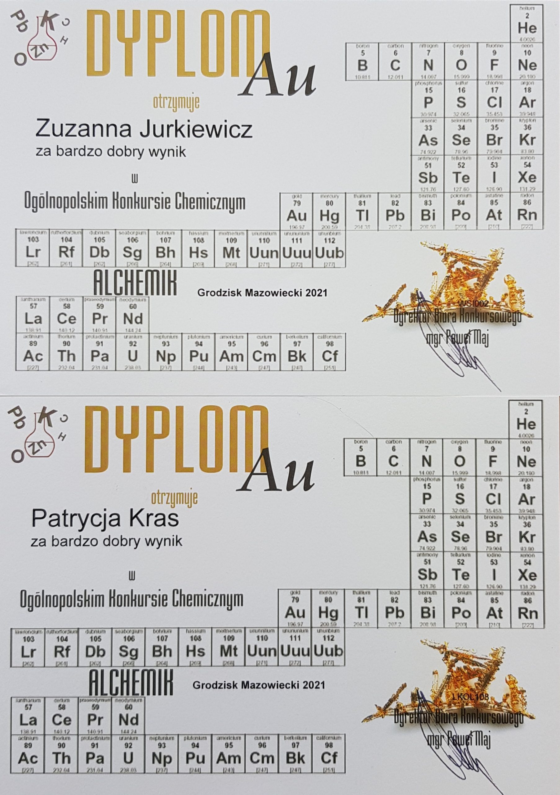 Miło nam poinformować, że w kolejnej edycji Ogólnopolskiego Konkursu Chemicznego Alchemik Złotymi Dyplomami Au za najlepszy wynik zostały nagrodzone dwie nasze uczennice, Zuzanna Jurkiewicz z klasy 2Eg i Patrycja Kras z klasy 1E, natomiast ośmiu naszych uczniów wyróżniono Srebrnymi Dyplomami Ag.