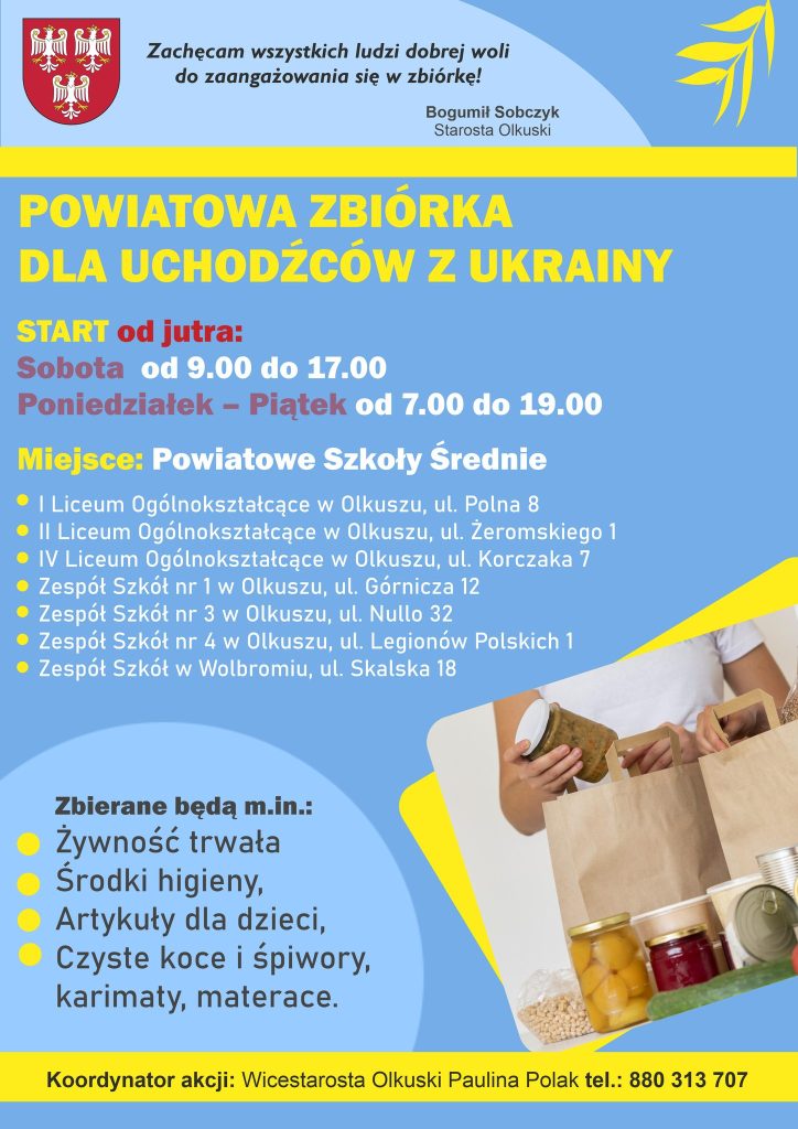 W ostatnich dniach wszyscy żyjemy sprawą Ukrainy i w tych trudnych chwilach w pełni solidaryzujemy się z jej obywatelami. Solidarność i wsparcie wyraźmy nie tylko słowami. Możemy pomóc realnie włączając się w zbiórkę zorganizowaną przez Starostwo Powiatowe. Nie pozostańmy obojętni.
