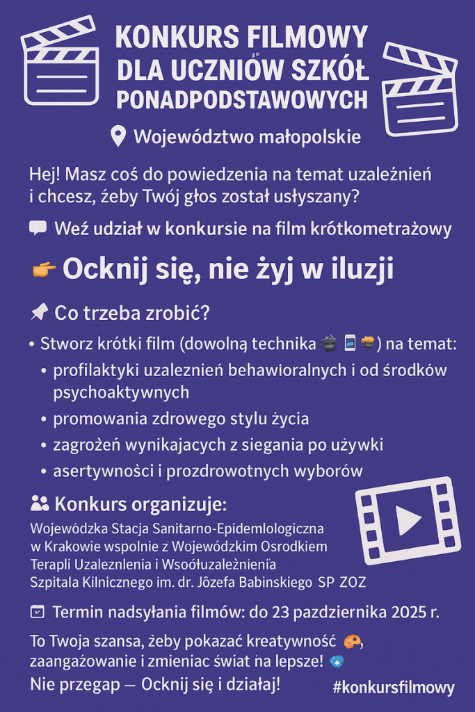 Hej! Masz coś do powiedzenia na temat uzależnień i chcesz, żeby Twój głos został usłyszany? Weź udział w konkursie na film krótkometrażowy pt. „Ocknij się, nie żyj w iluzji”.